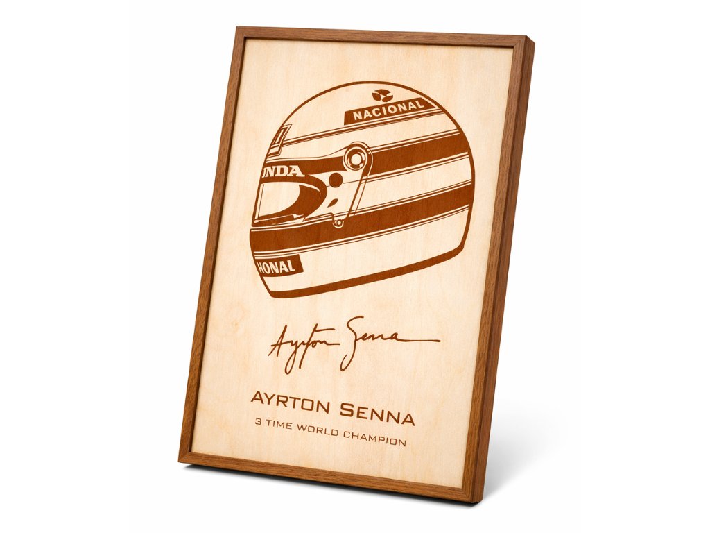 Dřevěný obrázek s rámem (formát A4) s ikonickou žluto-zelenou přilbou trojnásobného mistra světa F1 Ayrtona Senny. 🇧🇷 Must-have pro každého fanouška legendárního pilota! Nyní se stojánkem v hodnotě 99 Kč ZDARMA. 🎁