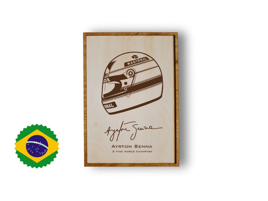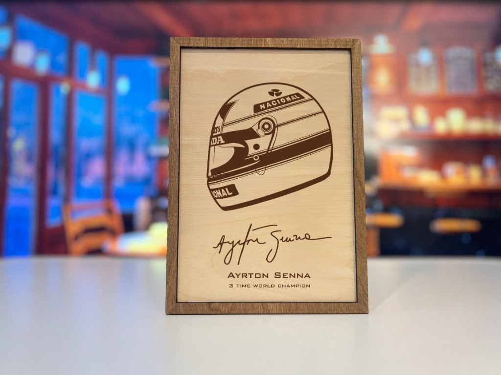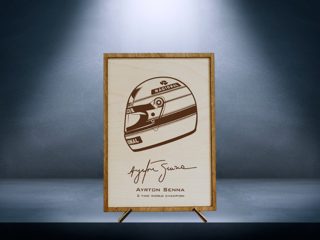 Dřevěný obrázek s rámem (formát A5 -148 × 210 mm) s ikonickou žluto-zelenou přilbou trojnásobného mistra světa F1 Ayrtona Senny. 🇧🇷 Must-have pro každého fanouška legendárního pilota! Nyní se stojánkem v hodnotě 99 Kč ZDARMA. 🎁
