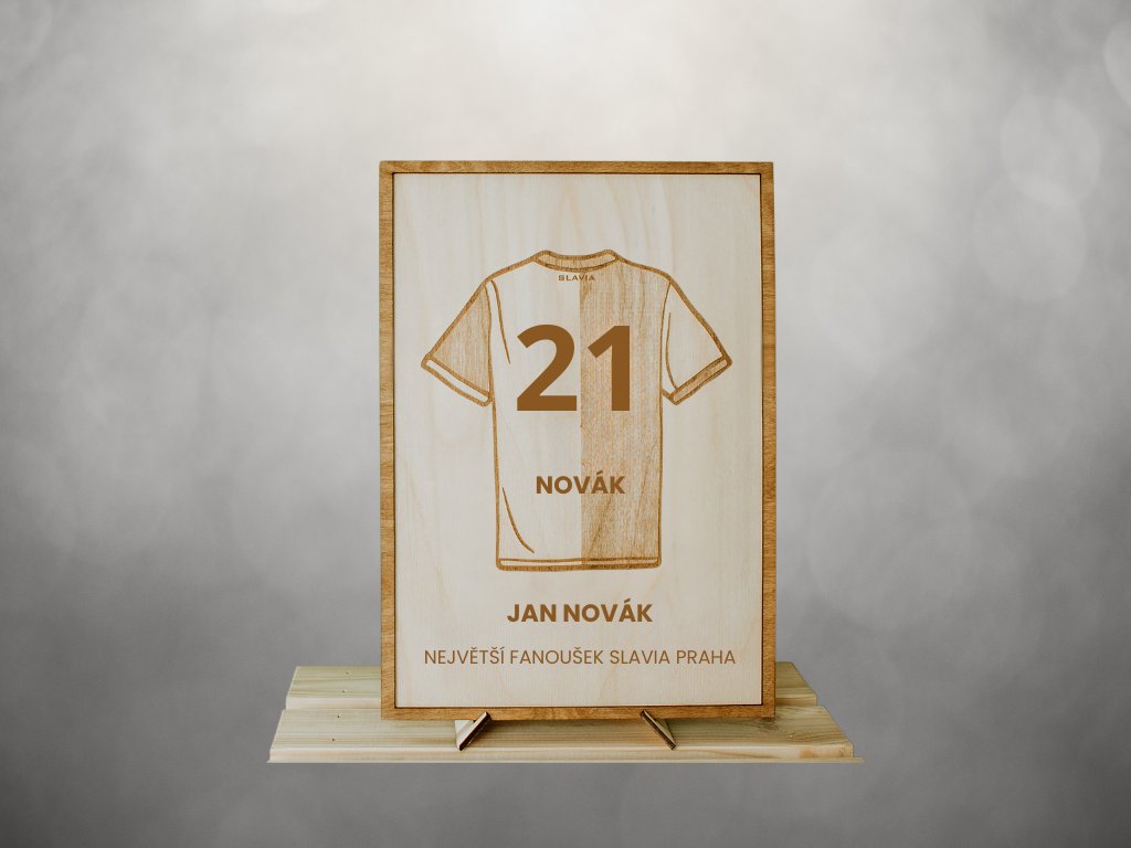 Dřevěný obraz s rámem ve formátu A5 s motivem dresu Slavie, vytvořený přesně podle tebe – číslo, jméno a citát na přání. Ideální doplněk do pokoje, kanceláře nebo fanouškovského koutku. Každý kus je originál, který vyjadřuje tvou vášeň, styl a osobnost. Skvělý dárek pro sportovní nadšence i jako jedinečná dekorace do interiéru.