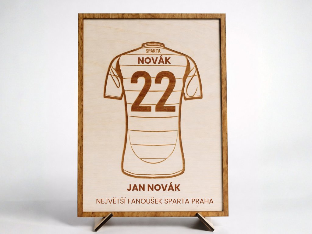 Dřevěný obraz s rámem ve formátu A4 s motivem dresu Sparty, vytvořený přesně podle tebe – číslo, jméno a citát na přání. Ideální doplněk do pokoje, kanceláře nebo fanouškovského koutku. Každý kus je originál, který vyjadřuje tvou vášeň, styl a osobnost. Skvělý dárek pro sportovní nadšence i jako jedinečná dekorace do interiéru.