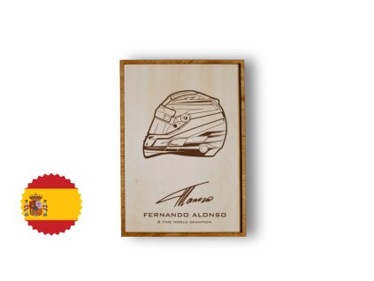 Stylový dřevěný obrázek s rámem (formát A5) zachycující ikonickou přilbu dvojnásobného mistra světa Fernanda Alonsa. Perfektní dekorace pro váš domov, kancelář nebo garáž....