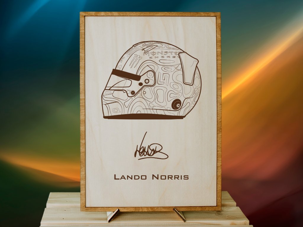 Dřevěný obrázek s rámem (formát A4) s ikonickou modro-oranžovou přilbou hvězdy F1 Landa Norrise. 🇬🇧 Must-have pro každého fanouška tohoto talentovaného pilota! Nyní se stojánkem v hodnotě 99 Kč ZDARMA. 🎁