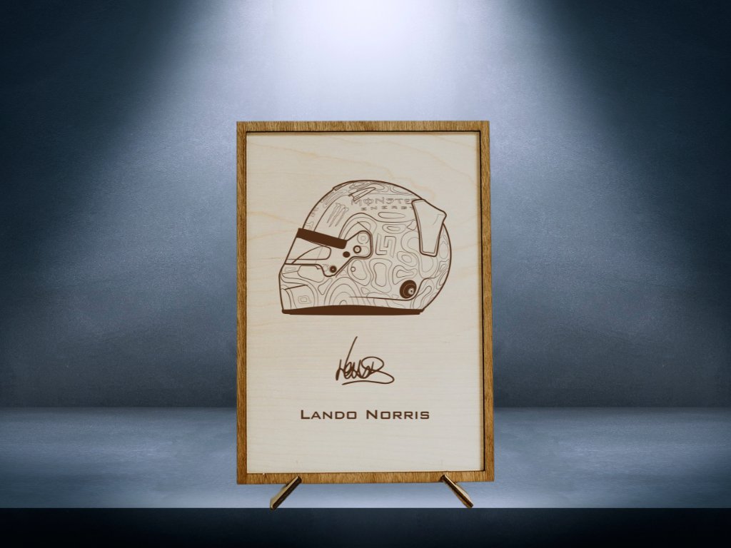Dřevěný obrázek s rámem (formát A5) s ikonickou modro-oranžovou přilbou hvězdy F1 Landa Norrise. 🇬🇧 Must-have pro každého fanouška tohoto talentovaného pilota! Nyní se stojánkem v hodnotě 99 Kč ZDARMA. 🎁 🎁